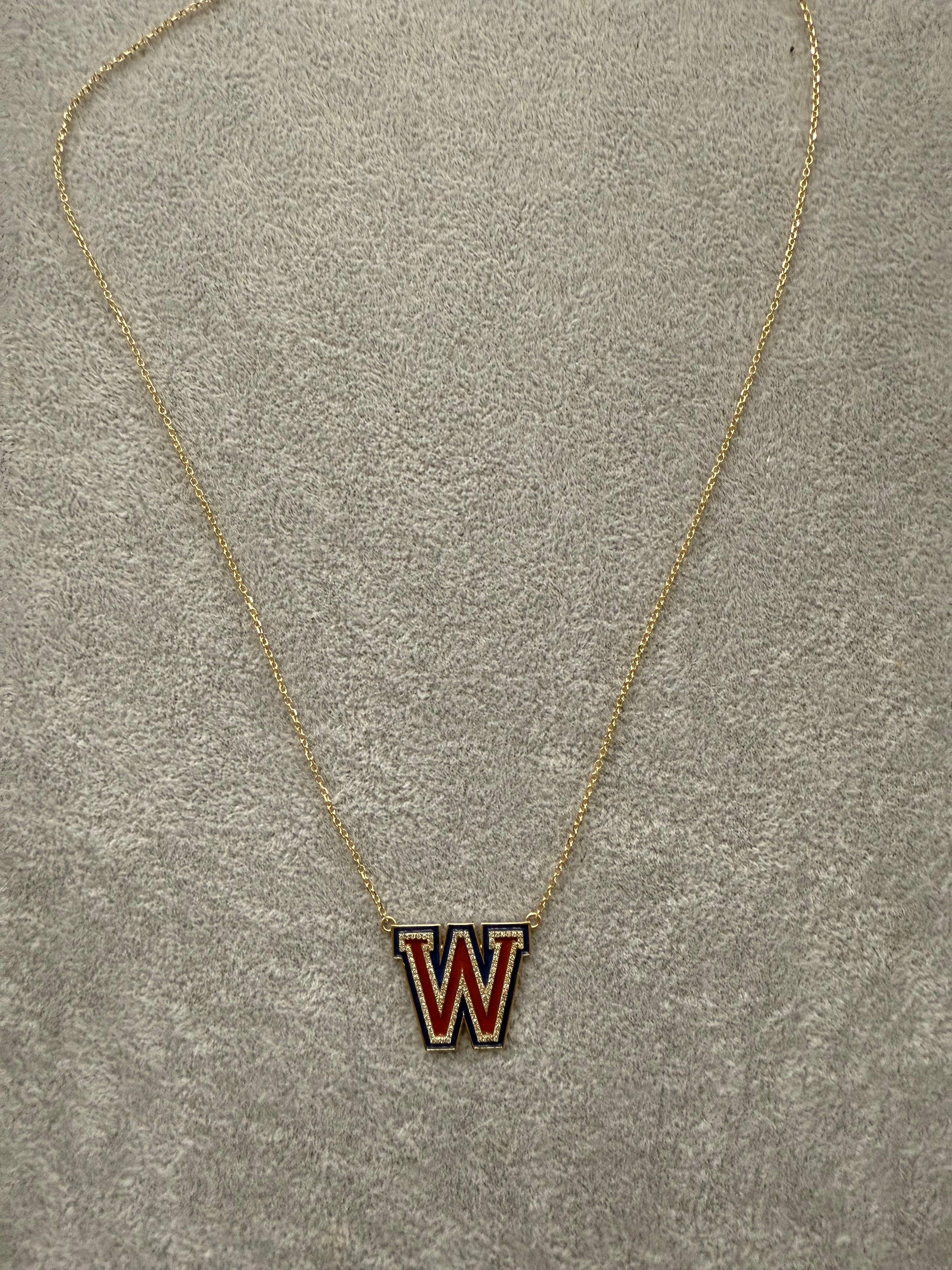 Wear your support for the Westlake Chaps with our stunning 14K White or Yellow Gold necklace. Featuring red and blue enamel and .23 CTW natural diamonds, this necklace not only showcases your team pride but also adds a touch of elegance to any outfit. Show your love for your team with style.